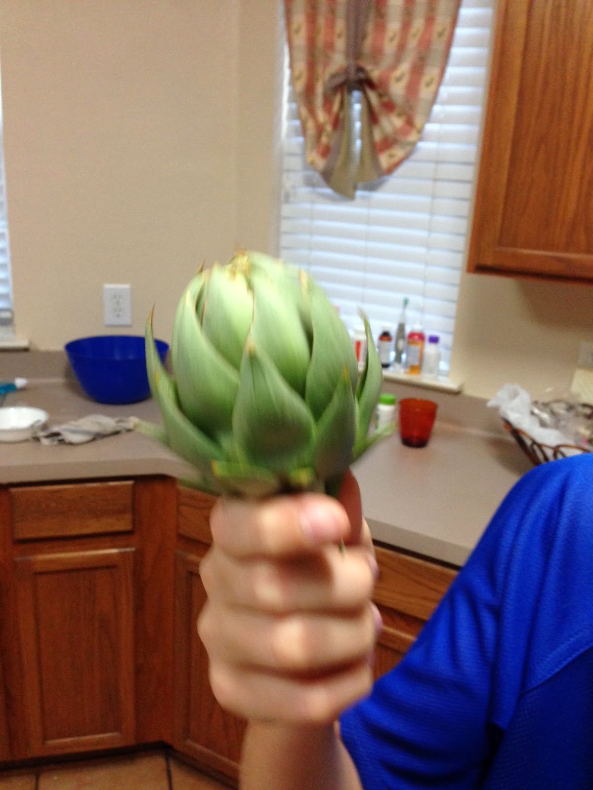 So 1 1/2 years ago, the Scouts went to a Garden store in town and let the Scouts each pick a veggie plant to take home. Cameron got me an artichoke plant because he knows I like them so much and that I've never planted one before. Well, I finally got my first artichoke! :) It's kind of small... next time I'll let it grow a little bit longer. I have 11 more buds growing... I'm excited! :)